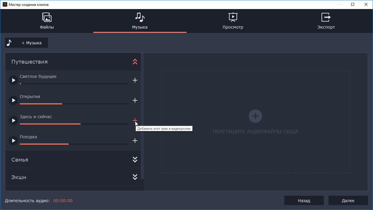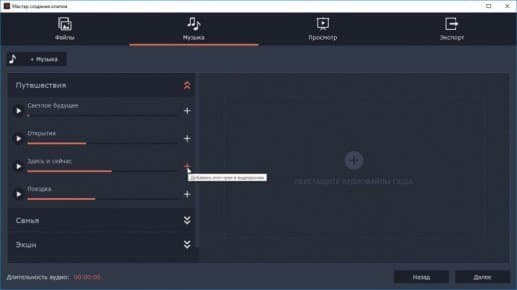 Следующий шаг - музыкальное сопровождение. Здесь уже достаточно выбрать одну из встроенных в программу музыкальных заготовок, которые разбиты на стили. Впрочем, если перебороть лень, можно импортировать и собственную композицию, которая кажется наиболее подходящей. Между прочим, любое импортируемое аудио также анализируется программой в целях поиска битов для последующего клипового монтажа.