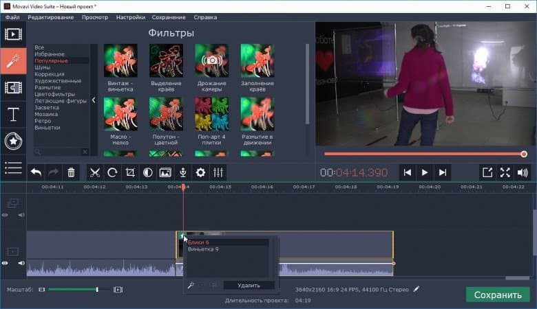В отличие от такой сложной процедуры, как стабилизация (сложной для программы, но не для пользователя), прочие эффекты и фильтры, примененные к обрабатываемому видео, работают в режиме реального времени, не требуя предварительного просчета. Достаточно выбрать в копилке эффектов нужный фильтр, мышкой перетащить его на клип и картинка в окне преобразится в соответствии с эффектом. Добавить блики, виньетки, раскрасить или постеризовать картинку, заполнить передвигающимися объектами, исключить выбранный цветовой диапазон (этот процесс называется кеингом), закрыть от зрителя часть кадра (лицо, автомобильный номер и пр.), ускорить или замедлить движение - эти и многие другие операции наглядны, производятся мышкой.