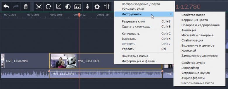 Как и во "взрослых" видеоредакторах, таймлиния здесь - самый важный инструмент. Именно на ней производится подавляющая часть операций. Отдельно хотелось бы указать на серьезное обстоятельство, которым почему-то пренебрегают все новички: контекстное меню. Нельзя забывать о наличии этого списка, всплывающего по нажатию правой кнопки мыши. В любом затруднении первое, что нужно сделать - нажать правую кнопку. Появившийся список команд полностью очерчивает круг доступных операций, остается только выбрать нужную.
