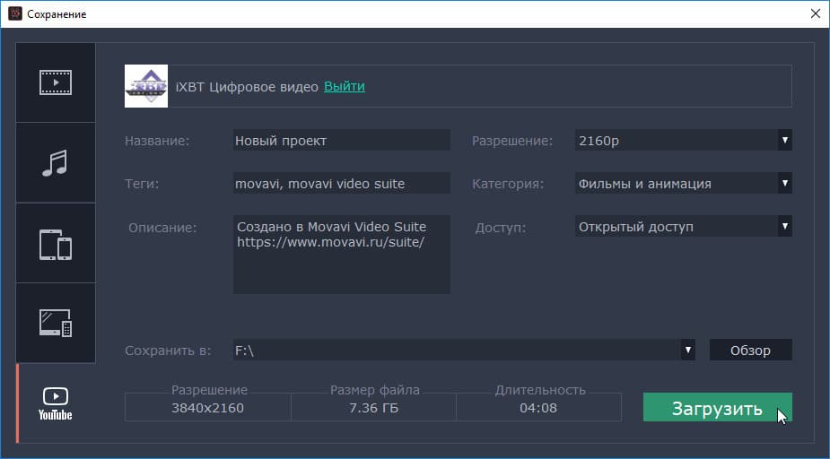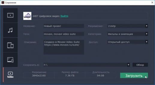 Если же материал планируется загрузить на YouTube, то задача упрощается до предела: достаточно ввести в программе данные своего аккаунта, и видео после обработки автоматически окажется на канале пользователя.