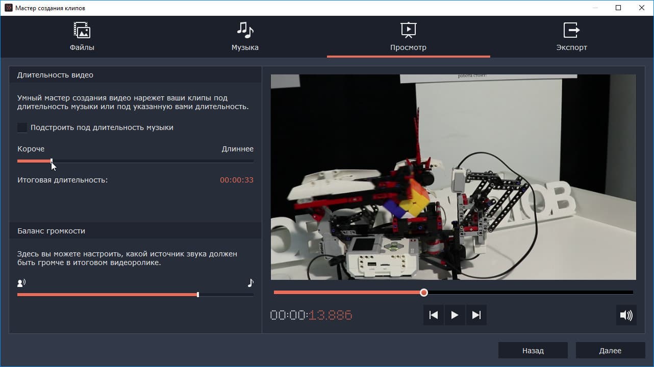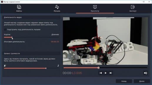 Все, клип готов! Хотя, на самом деле, он был создан еще в момент импорта видеоматериала, когда программа анализировала видеоролики. Изменяя с помощью ползунка длительность ролика, пользователь всего лишь заставляет программу исключать некоторый материал: чем короче длительность клипа, тем меньшее количество роликов в нем участвуют и тем короче смонтированные отрезки. А чтобы убедиться в монтажных умениях автоматики, можно тут же запустить предварительный просмотр подготовленного клипа.