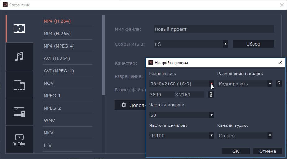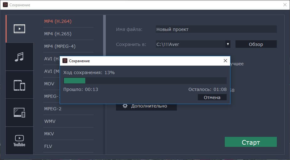 С последним этапом мы уже знакомились - это стандартный экспорт в видеофайл или заливка на YouTube. Список предлагаемых форматов ничем не отличается от аналогичного инструмента, присутствующего в полноценном видеоредакторе.