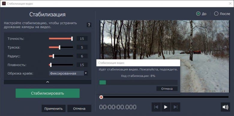 Например, если требуется стабилизировать видеоролик, снятый с рук или при ходьбе, то нужно выбрать соответствующий задаче инструмент Стабилизация. По этой команде программа запустит особый встроенный модуль, где с помощью настроек можно увеличить или уменьшить степень сглаживания движения.