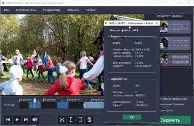 В отличие от них, резчик Movavi не капризничает, а послушно открывает и режет файлы, даже если в них имеется специфическое содержимое. Похоже, он попросту игнорирует дополнительные служебные потоки, не отвечающие стандартам, и работает только с известным ему контентом. Ещё одна важная деталь: программе не требуется предварительная индексация видеофайлов, какого бы формата они ни были - любое видео открывается практически мгновенно. Попытки получить ошибку на каких-то форматах, "уронить" программу или заставить ее зависнуть не привели к успеху. Резчик без запинки открывает и обрабатывает любые "древние" форматы наподобие *.flv в Sorenson Spark, RealVideo *.rmvb со звуком Cooker (кто о нем помнит? Да как такое вообще можно помнить?), не говоря уже о банальных DVD, Xvid, MOV и даже WMV. С современными кодеками приложение расправляется так же успешно, включая 10-битные потоки с размером кадра 4K, сжатые в HEVC (а'ля Ultra HD Blu-ray). Трудно отыскать приложение, показывающее подобную всеядность. Если вообще возможно.