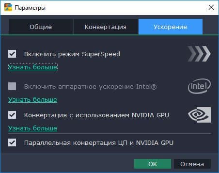 Скорость кодирования напрямую зависит от количества добавленных к клипам фильтров и эффектов, а также от наличия у пользователя оборудования, которое поддерживает программа. Так, для кодирования, помимо центрального процессора, могут быть задействованы аппаратные мощности графических ускорителей NVIDIA или Intel.