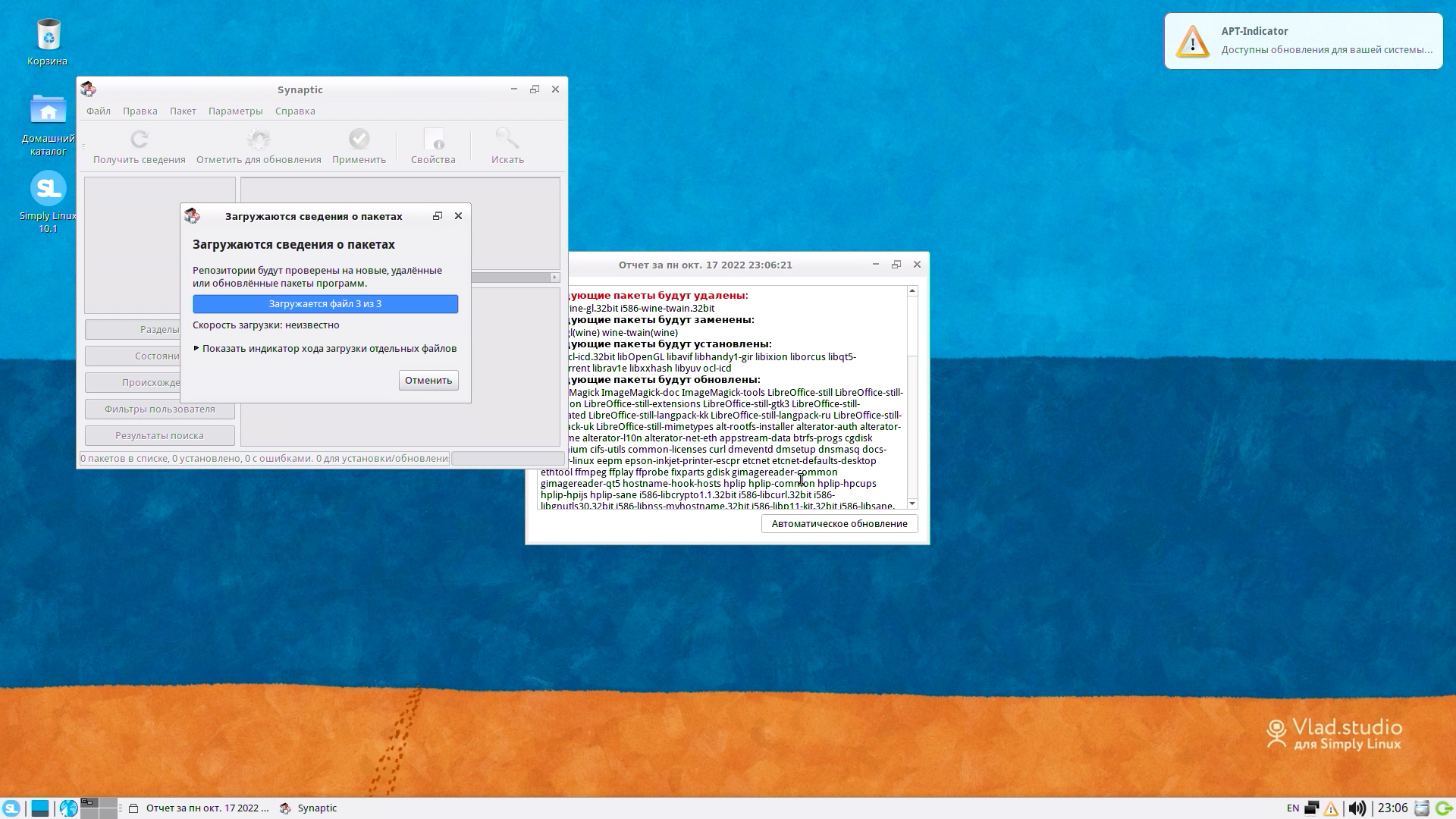 Затем (это происходит после первой установки) менеджер пакетов Synaptic (https://www.nongnu.org/synaptic/) автоматически проверяет наличие обновлений и позволяет установить всё необходимое.