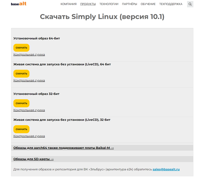 Систему можно скачать с официального сайта компании «Базальт СПО» (https://www.basealt.ru/simplylinux/download) в виде образа и записать на флешку с помощью программ Rufus (https://rufus.ie/ru/) или Alt Media Writer (https://github.com/altlinux/ALTMediaWriter).