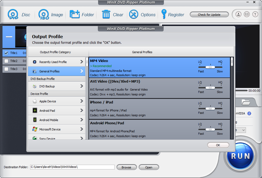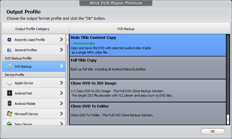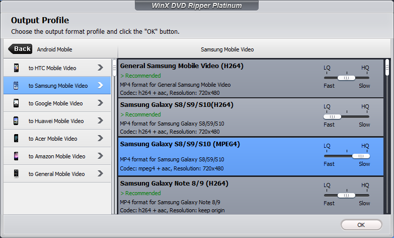 У WinX DVD Ripper есть несколько ключевых особенностей. Во-первых, приложение содержит более 250 профилей для сжатия видео под все популярные устройства и платформы: смартфоны, планшеты, видеоплееры и даже видеохостинги. В каждый из профилей вшиты оптимальные настройки: разрешение, частота кадров, битрейт, что позволяет добиться максимального качества видео без высокой нагрузки на устройство.