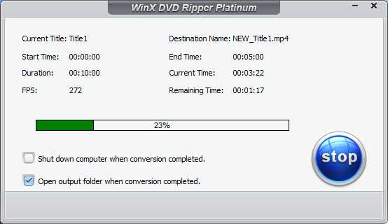 В процессе конвертации WinX DVD Ripper Platinum точно показывает оставшееся время и скорость обработки кадров в FPS. Нагрузка на компьютер при этом очень невелика, особенно при включенных Intel Quick Sync и NVEnc, это позволяет комфортно пользоваться компьютером во время копирования DVD.