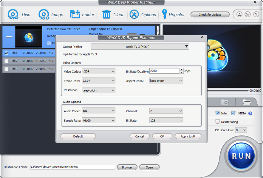 При этом WinX DVD Ripper Platinum предлагает доступ к детальным настройкам качества видео, субтитрам, аудиодорожкам, размерам кадра — это избавляет от необходимости дальнейшей обработки скопированного видео.