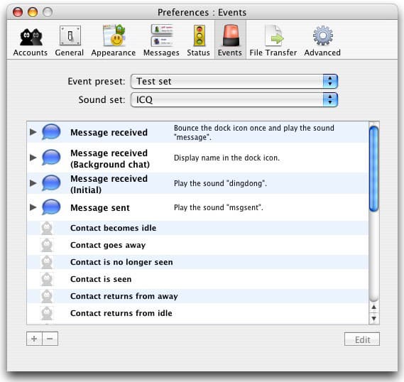 Здесь же настраивается реакция программы на возникновение тех или иных событий. Вы можете установить привычный звуковой комплект, скажем, ICQ или iChat, или же заняться установкой своего собственного. Кроме звука легко настраиваются различные действия клиента, например, при получении нового сообщения вы можете заставить Adium не только издать характерный сигнал, но и: «подпрыгнуть» иконке в Dock (с отображением имени контакта или без), высветить определенное сообщение, запустить скрипт, произвести Growl-уведомление и так далее.