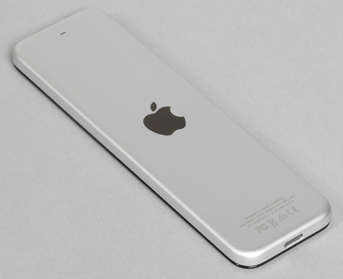На верхнем торце пульта находится окошко ИК-передатчика, а с противоположной стороны — разъем Lighting для зарядки или фирменного ремешка. Последний представляет собой полоску из кожи с колечком. Закрепляется он в разъеме с использованием специальных защелок.