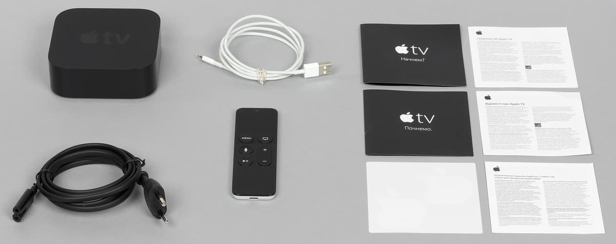 В коробке находится плеер, сетевой кабель питания, пульт дистанционного управления, кабель Lighting и несколько листовок.