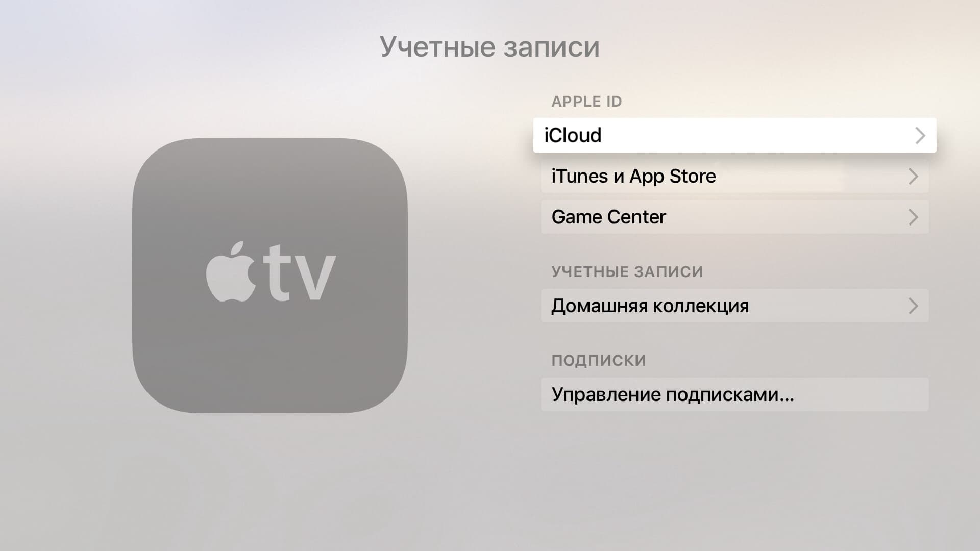 В отличие от предшественников, четвертое поколение поддерживает использование стандартных учетных записей iCloud, iTunes и AppStore. Дополнительно реализовано взаимодействие с Game Center и «Домашней коллекцией». Указание Apple ID позволяет вам просматривать фильмы и прослушивать музыку из магазина, устанавливать дополнительные программы и взаимодействовать с облачными сервисами компании. Отметим, что здесь речь идет именно о аккаунтах самой Apple. В случае работы с приложениями, где требуется собственная регистрация, эта информация будет указываться в них самих.