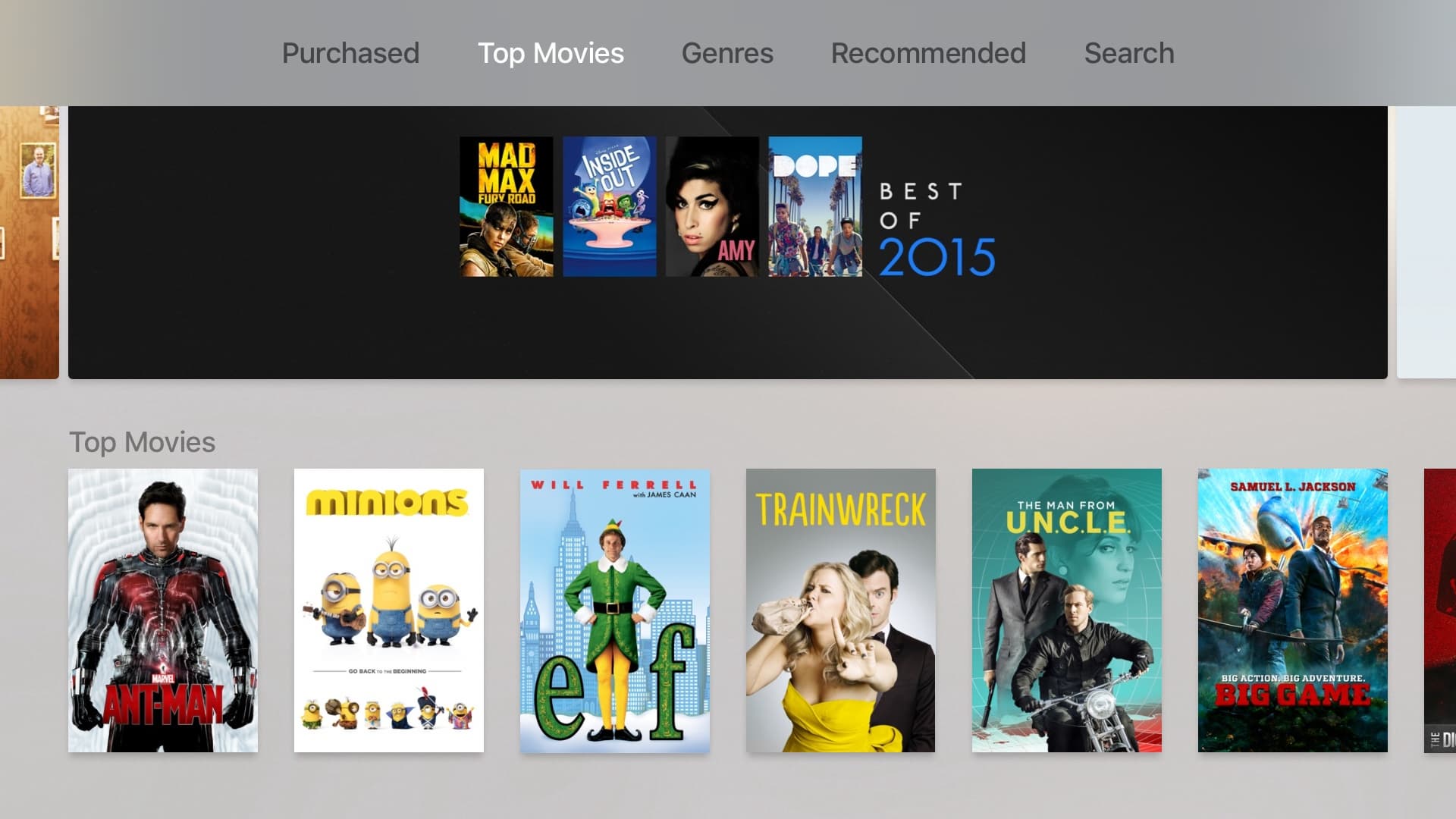 Он включает в себя контекстный блок с трейлерами, недавно просмотренным контентом и другой подобной информацией. Под ним идут иконки установленных на устройстве приложений. В состоянии «из коробки» здесь есть только основные программы: фильмы, ТВ-шоу и музыка из iTunes, App Store, фотогалерея, поиск, компьютеры и настройки.