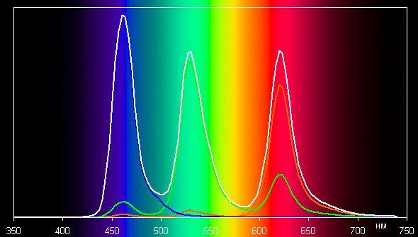 Спектры типичны для OLED — области первичных цветов хорошо разделены и имеют вид относительно узких пиков: