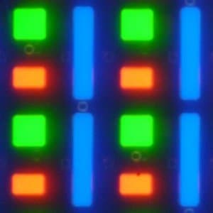 В этом экране используется матрица AMOLED — активная матрица на органических светодиодах. Полноцветное изображение создается с помощью субпикселей трех цветов — красного (R), зеленого (G) и синего (B) в равном количестве, что подтверждается фрагментом микрофотографии: