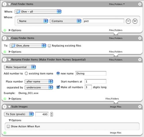 Приступаем. В Automator выбираем слева Finder и перетаскиваем в правое окно 3 задачи одна за другой: Find Finder Items -> Copy Finder Items -> Rename Finder Items. Затем выбираем слева Preview и четвертым пунктом добавляем Scale Images. Каждый пункт настраивается практически интуитивно, вряд ли возникнут сложности. Пример показан на скриншоте.