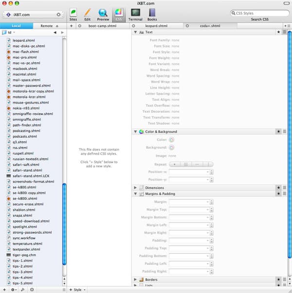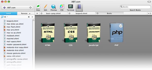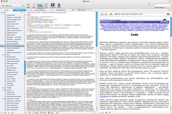 Возьмем, скажем, набор программ для веб-разработчиков, сетевых авторов, или верстальщиков: если вы, например, редактируете какой-то HTML-код на сайте, вам нужно иметь открытым текстовый редактор, FTP-клиент, браузер (для просмотра результатов деятельности), иногда терминал и пару книг… Словом, индивидуальный набор любимых приложений, каждое с необходимыми настройками, своим неповторимым интерфейсом и особенностями. Честно говоря, мы и не рассчитывали на то, что появится одна программа, качественно выполняющая все эти функции — ведь это больше похоже на утопию, были бы для начала хорошими отдельные приложения. Однако новое детище компании Panic нас приятно удивило и заслуживает обязательного рассмотрения.