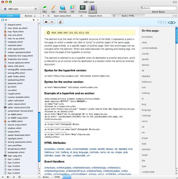 В Coda есть четыре встроенных справочника по языкам HTML, CSS, JavaScript и PHP. Они пригодятся опытным пользователям — время от времени почти у всех возникает желание посмотреть значение тех или иных тегов. Правда, стоит отметить, что каждая страница загружается из интернета, так что владельцам ноутбуков подучить язык в дороге вряд ли получится. В то время, такой подход дает надежду на дальнейшее пополнение библиотеки новыми книгами.