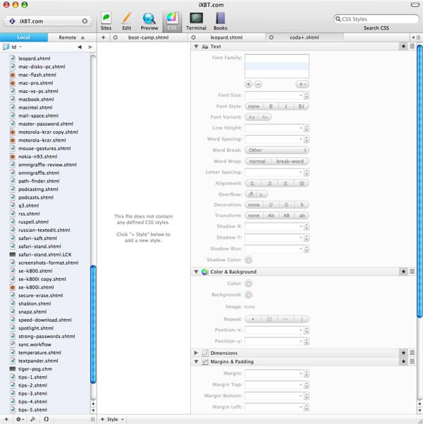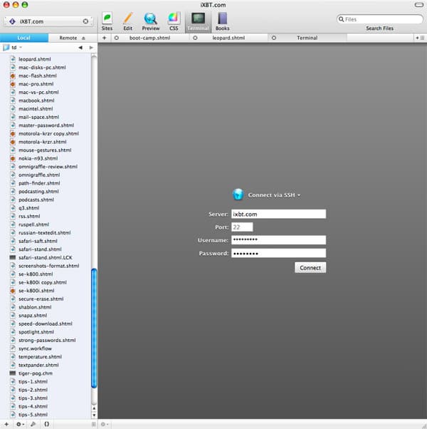 Возможности FTP-клиента проявляют себя самым лучшим образом — сказывается многолетний опыт создания Transmit. В Coda используется самый современный движок Transmit Turbo, и при хорошем канале связи забываешь, что работаешь на удаленном сервере.
