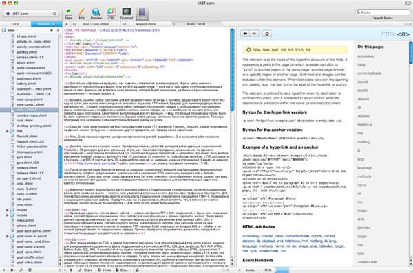 Помимо tab-ов, вы можете разделить рабочую область окна Coda (где вы редактируете текст) на несколько частей, горизонтальных или вертикальных, и открыть в каждой из них документ. Таким образом, например, вы можете сравнивать различные файлы. Особенно приятно, что вы можете иметь в разных частях разный тип отображения — например, слева редактировать код сайта, а справа открыть превью и сразу отслеживать то, как вы влияете на конечный результат. Или открыть в другой части окна книгу с синтаксисом языка HTML (об этом мы поговорим позже). При этом, открыть несколько полноценных окон Coda (как вы, возможно, привыкли в других программах) не получится — при нажатии CTRL+N открывается новый tab. Впрочем, сложно представить ситуацию, когда это может понадобиться — ведь есть возможность открыть несколько tab-ов и разделить окно на несколько частей для работы с различными документами.