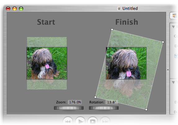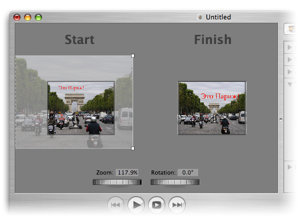 Каждое состояние изображения имеет настройки масштаба и поворота, которые можно регулировать как с помощью мыши, так и инструментами Zoom и Rotation, которые находятся под рабочей областью. Во время воспроизведения слайд-шоу, текущий кадр будет постепенно переходить из «левого» положение в «правое». Приложив немного фантазии, с помощью Pan&Zoom можно создавать эффекты скроллинга, вращения и масштабирования, которые помогут расставить акценты на нужных деталях фотографий или просто добавить слайд-шоу динамики. С помощью инструмента Motion производится тонкая настройка скорости «превращения» изображения.