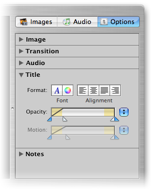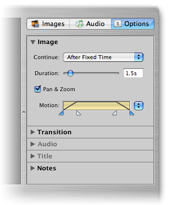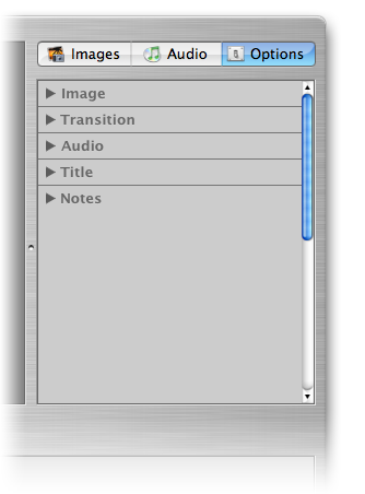 Для того чтобы начать настройку отображения текущего слайда, нужно открыть вкладку браузера Options. В ней расположено несколько раскрывающихся панелей — Image, Transition, Audio, Title и Notes.
