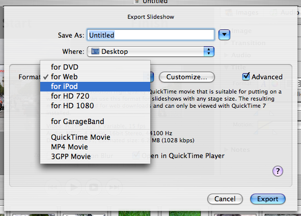 Те пользователи, которые захотят создать «нестандартные» ролики, могут, включив чекбокс Advanced, получить доступ к полным настройкам экспорта средствами QuickTime и выбрать необходимые кодеки, их параметры, а также фильтры. Таким образом, можно создать, например, видеоролик в формате 3GPP, пригодный для воспроизведения на большинстве современных мобильных телефонов.