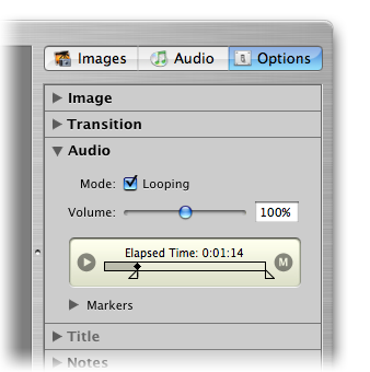 Панель Audio позволяет включить повтор воспроизведения выбранного трека, а также расставить маркеры, которые в сочетании с опцией Continue At Audio Marker из панели Image позволяют задать длительность отображения текущего слайда в зависимости от музыкального сопровождения.
