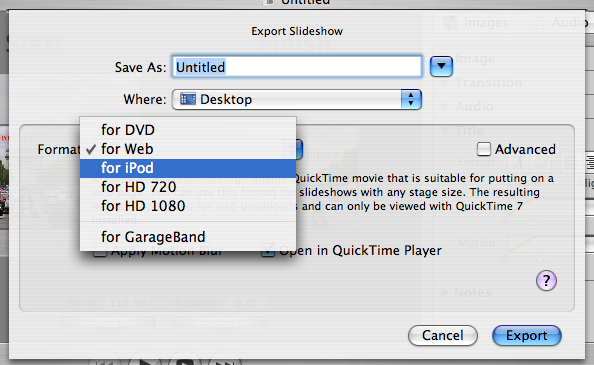 Программа позволяет получить видеоролики для DVD, плеера iPod, публикации в Интернет, форматов 720p и 1080p буквально несколькими нажатиями кнопки мыши. В окне экспорта выводится подробная информация об используемых в каждом случае кодеках и формате (размерах) изображения.