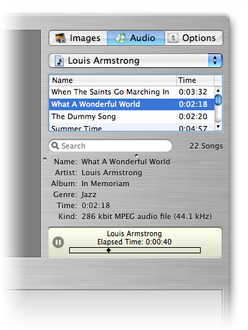 То же самое касается и музыкального оформления слайд-шоу: если нажать на кнопку Audio, можно выбрать любую композицию из библиотеки iTunes и прослушать ее с помощью мини-плеера. Перетащив мышкой нужный трек в область плейлиста, получаем звуковую дорожку нашего проекта.
