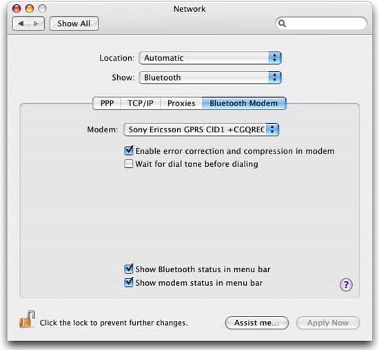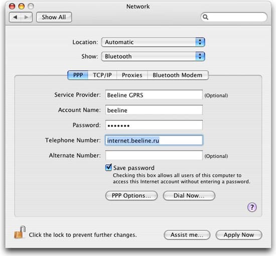 В панели System Preferences выберите пункт Network и установите параметры самого соединения (в поле «Show» выберите пункт «Bluetooth» и заполните форму). Вместо телефонного номера обязательно пропишите APN, это нужно для корректной работы скрипта.