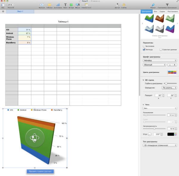 С другой стороны, вовсе не факт, что отображение этих диаграмм в других программах (при сохранении в .xslx) будет корректным. Вот пример 3D-диаграммы, сделанной в Numbers и открытой в OpenOffice.