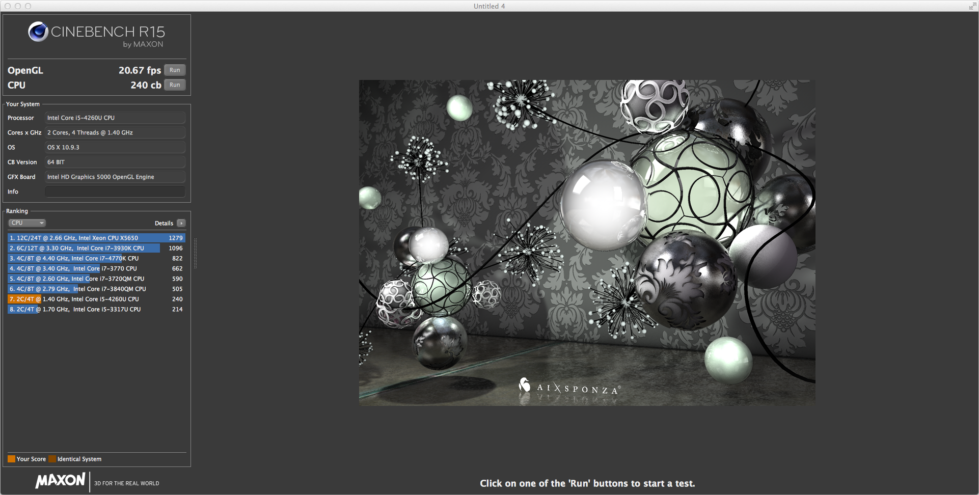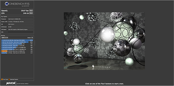 Следующий бенчмарк — Maxon Cinebench R15, в котором выполняется рендеринг трехмерной сцены. Рендеринг может производиться как средствами CPU, так и средствами GPU (OpenGL). И здесь результаты нового младшего iMac практически не отличаются от результатов MacBook Air (Early 2014).