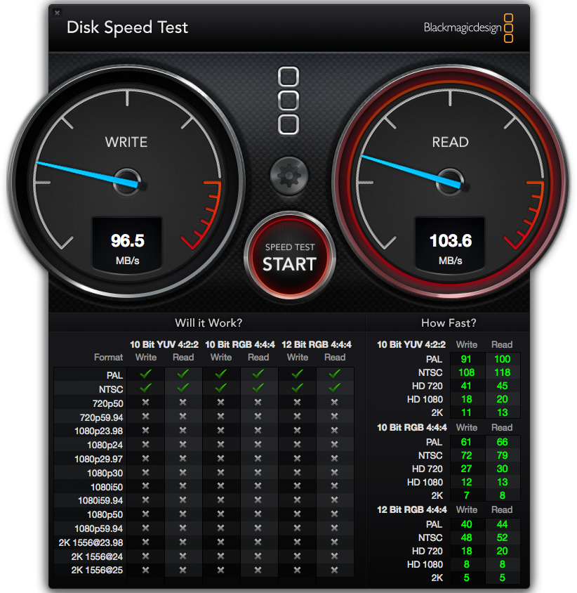 Последний тест — Blackmagic Disk Speed Test, измеряющий производительность накопителя. Увы, в этом тесте младший iMac (Mid 2014), как и следовало ожидать, не впечатляет: скорости чтения и записи находятся на уровне 100 МБ/с, что, конечно же, по сегодняшним меркам очень мало.