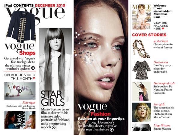 Style.com — замечательное приложение, очень удобное и приятное. Однако, оно не содержит уникального контента, который бы не был доступен просто через браузер. Совсем иное дело — iPad-версия Vogue UK, британской версии главного журнала о моде. До недавнего времени Vogue игнорировал iPad (тогда как другой журнал того же издательского дома — GQ — одним из первых сделал iPad-версию), но, как оказалось, эта неторопливость объяснялась перфекционизмом и стремлением предложить пользователям iPad наиболее совершенно приложение, достойное славного имени печатного журнала.