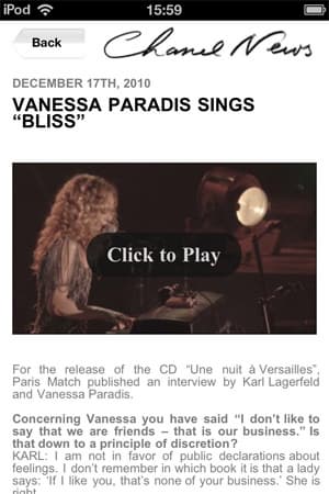 Второй раздел — Chanel News — подгружается из интернета и, соответственно, требует наличия сети Wi-Fi или 3G. К счастью, новости представляют собой не просто сухие (или же восторженные) строки пресс-релизов. Там могут быть бэкстэйдж-фотографии показов, развернутые интервью (например, на момент написания статьи там было совместное интервью Карла Лагерфельда и Ванессы Паради), видеоролики и прочие «вкусности».