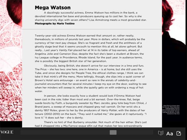 Другая возможность — просмотр роликов, связанных с теми или иными страницами журнала. Например, читая статью об Эмме Уотсон, иллюстрированную съемкой знаменитого фотографа Марио Тестино, мы можем посмотреть ролик о работе над фотосессией. Еще эффектнее сделана съемка Star Girls (лучшие топ-модели десятилетия): сначала вы видите фотографию, скажем, Клаудии Шиффер, а потом — буквально несколько секунд видео, в котором она позирует. То есть фотография Клаудии как бы оживает на ваших глазах. И также с некоторыми другими моделями.