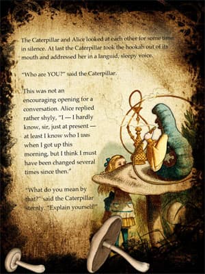 Понятно, что дизайн и организация книги (или книг, если их в приложении несколько) будет индивидуальной и определяемой исключительно разработчиками данного приложения. Это дает возможность создавать поистине удивительные вещи, которые даже и книгами-то не назовешь — настолько необычно они сделаны. Один из ярких примеров такого приложения — Alice for the iPad, электронная версия книги Льюиса Кэрролла «Алиса в стране чудес».