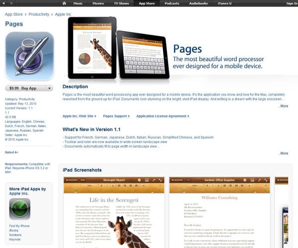 Каждое из этих приложений стоит 9,99 долларов. Это немало для AppStore, где редко увидишь продукт дороже 5 долларов. Однако, если сравнить суммарную цену на Pages, Numbers и Keynote со стоимостью пакета iWork для Mac OS X (включающего как раз эти три программы), то станет ясно, что цена более чем щадящая (digital download версия iWork стоит 79 долларов, коробочная и того дороже).