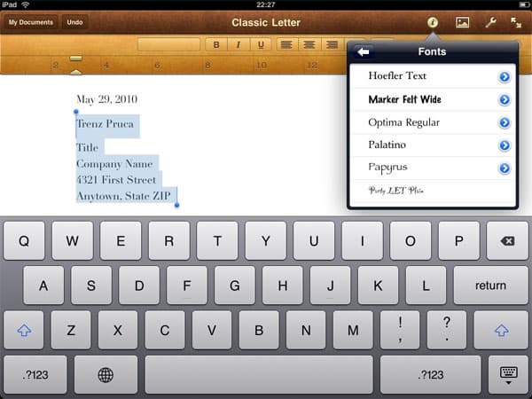 Как мы помним, одновременно с самим iPad компания Apple анонсировала офисные приложения Pages, Numbers и Keynote, портированные с платформы Mac OS X на iOS и адаптированные для multitouch-управления. Именно эти приложения обещают превратить ваш планшет в нетбук, который можно было бы брать с собой для работы с текстами, таблицами и презентациями. Разумеется, для максимального удобства стоит приобрести клавиатуру, однако, если вы работаете с текстами вне офиса или дома не так часто или не хотите таскать дополнительные аксессуары, можно ограничиться и виртуальной клавиатурой.