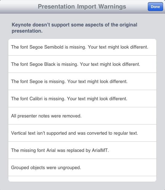 Вот такой немаленький список предупреждений выдает Keynote при попытке импорта презентации, созданной в PowerPoint. А ведь это не какой-то особый тестовый файл для выявления недостатков и несовместимостей приложения, а реальная коммерческая презентация, причем, без особых ухищрений (вроде видеовставок или объектов из интернета)…