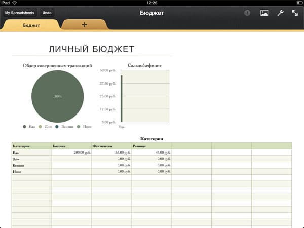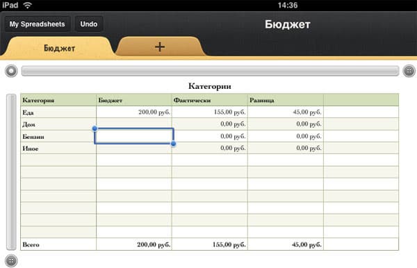 В целом, все, что касается экспорта и импорта файлов, а также сохранения изменений, аналогично Pages. Так что не будем повторять наши претензии, а рассмотрим удобство создания и редактирования таблиц. Как и Numbers на Mac OS X, iPad-вариант программы предлагает ряд шаблонов. Можно создать и таблицу с нуля. Причем, сделать это очень легко. Стоит также отметить удобство добавления новых столбцов и строк в таблице: просто кликаем на таблицу и тянем за кружочек в правом верхнем или в левом нижнем углу таблицы.