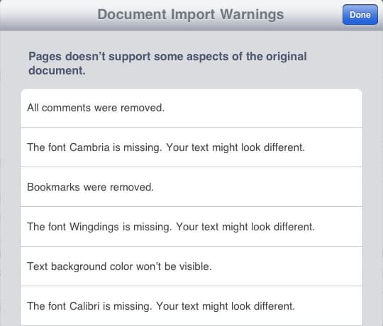 Что это значит? Что все ссылки, а также примечания и цветовые выделения будут потеряны. Кроме того, будут изменены шрифты (хотя в документе использовались не то чтобы очень экзотические шрифты — Cambria, Calibri). Разумеется, это делает практически невозможным использование iPad-версии Pages в серьезной работе. Так, набрать на скорую руку простенький текст, законспектировать лекцию, записать некоторые спонтанные мысли — да, можно. Но ни над научным текстом не поработать, ни отрецензировать чужой текст… Куда это годится?