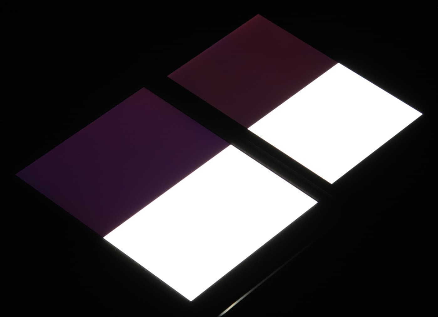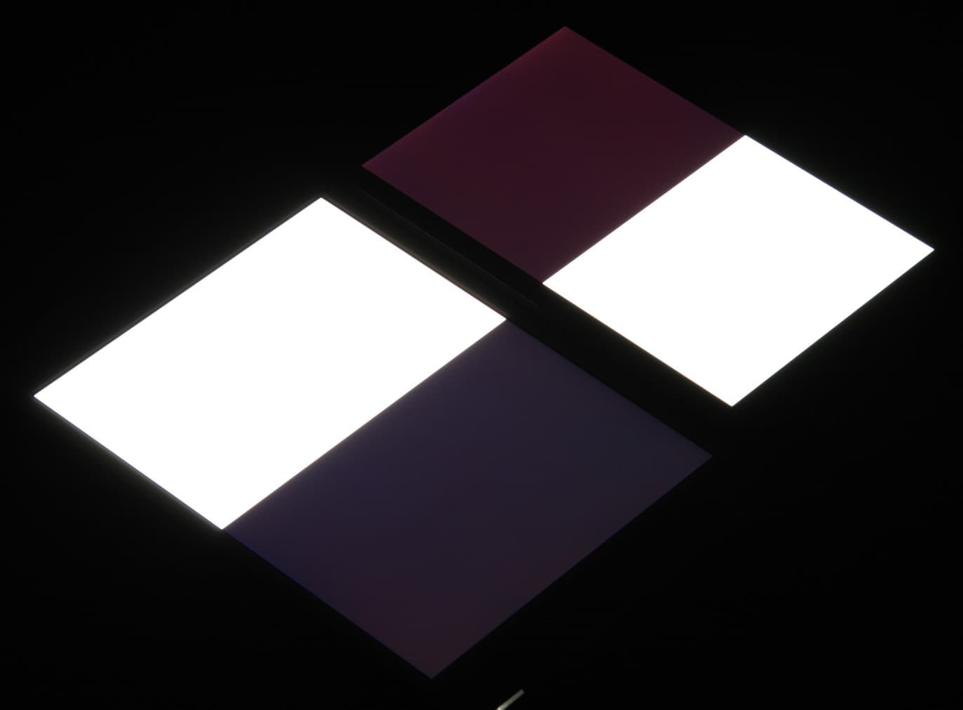 Яркость под углом у экранов уменьшилась (как минимум в 5 раз, исходя из разницы в выдержке), но в случае iPad mini 4 падение яркости меньше. Черное поле при отклонении по диагонали высветляется слабо и приобретает фиолетовый или красно-фиолетовый оттенок. Фотографии ниже это демонстрируют (яркость белых участков в перпендикулярном плоскости экранов направлении примерно одинаковая!):