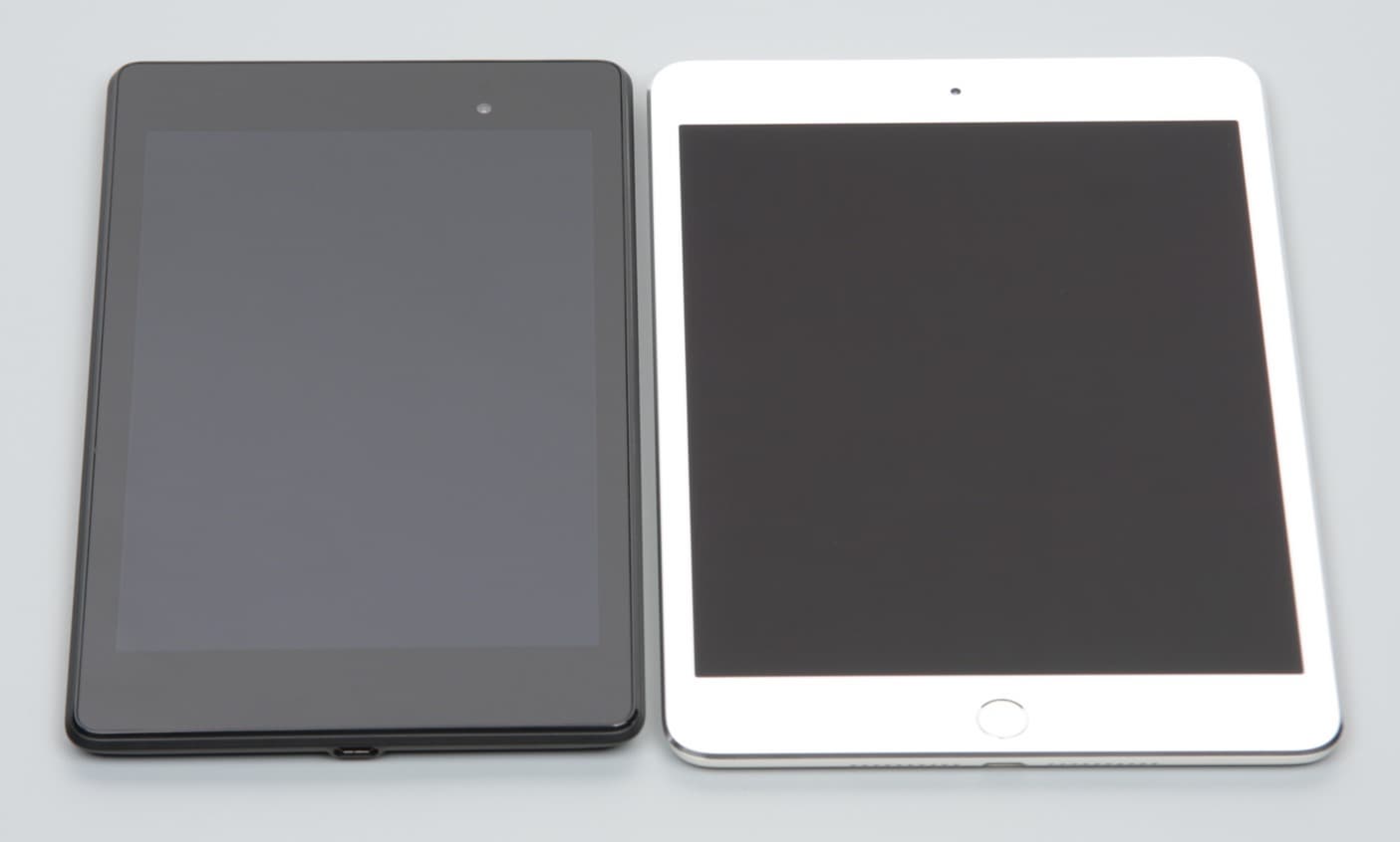 Экран имеет хорошие углы обзора без значительного сдвига цветов даже при больших отклонениях взгляда от перпендикуляра к экрану и без инвертирования оттенков. Для сравнения приведем фотографии, на которых на экраны iPad mini 4 и Nexus 7 выведены одинаковые изображения, при этом яркость экранов изначально установлена примерно на 200 кд/м² (по белому полю во весь экран, на iPad mini 4 это соответствует значению 65% яркости при использовании сторонних программ), а цветовой баланс на фотоаппарате принудительно переключен на 6500 К. Перпендикулярно к экранам белое поле: