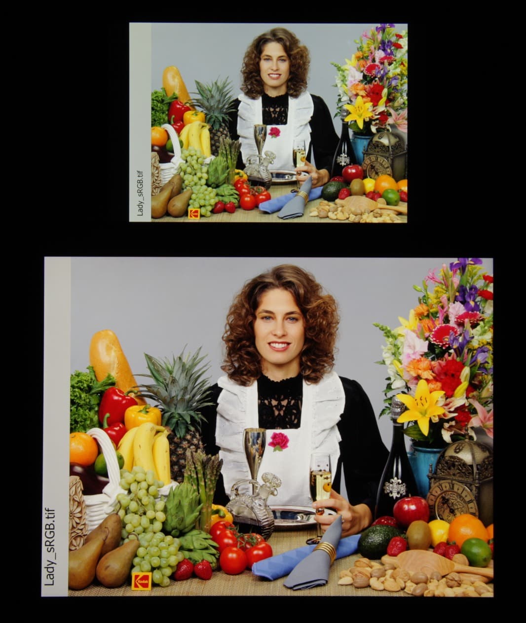 Это относится к тем изображениям, в которых прописан профиль sRGB или не прописано вообще никакого профиля. Однако родным для топовых современных устройств Apple (как минимум для iPhone 7 и iPhone 7 Plus, iPad Pro 9,7″, MacBook Pro и др.) является цветовое пространство Display P3 с немного более насыщенными зеленым и красным цветами. Пространство Display P3 основано на SMPTE DCI-P3, но имеет точку белого D65 и гамма-кривую с показателем примерно 2,2. Кроме того, производитель заявляет, что начиная с iOS 9.3 на системном уровне поддерживается управление цветом, это облегчает приложениям под iOS задачу правильно выводить на экран изображения с прописанным цветовым профилем. Действительно, дополнив тестовые изображения (файлы JPG и PNG) профилем Display P3, мы получили цветовой охват шире sRGB (вывод в Safari):