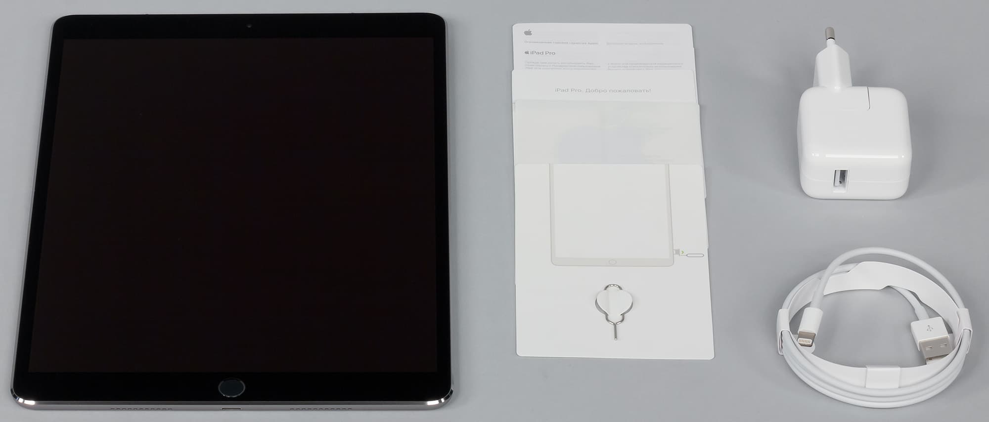Что касается комплектации — здесь тоже никаких сюрпризов: листовки, зарядное устройство, кабель Lightning, наклейки и ключик для извлечения колыбельки SIM-карты. Зарядное устройство имеет такую же мощность, как у iPad Pro 12,9″: 12 Вт (2,4 А, 5,2 В). Это больше, чем у iPad Pro 9,7″.