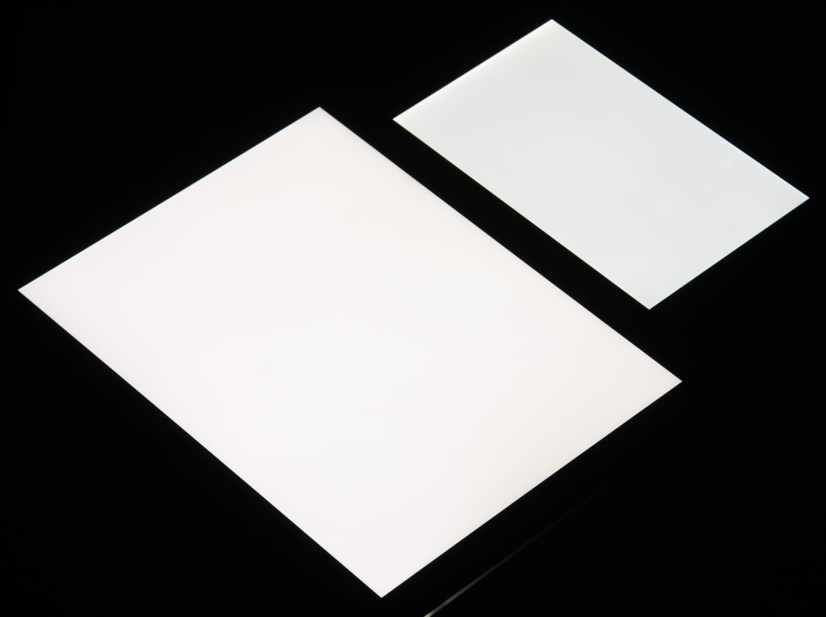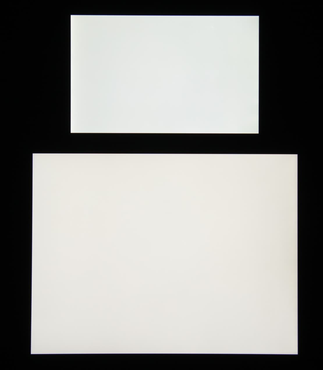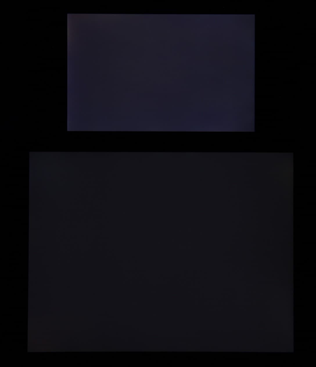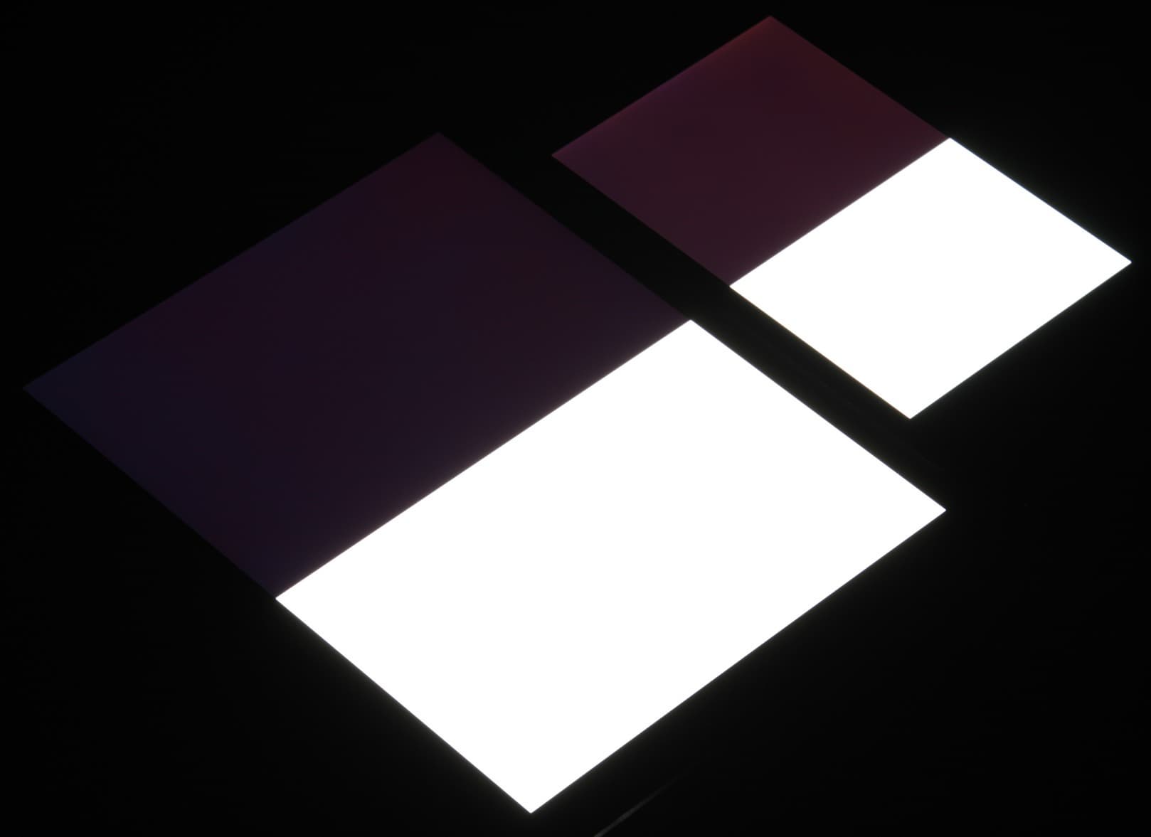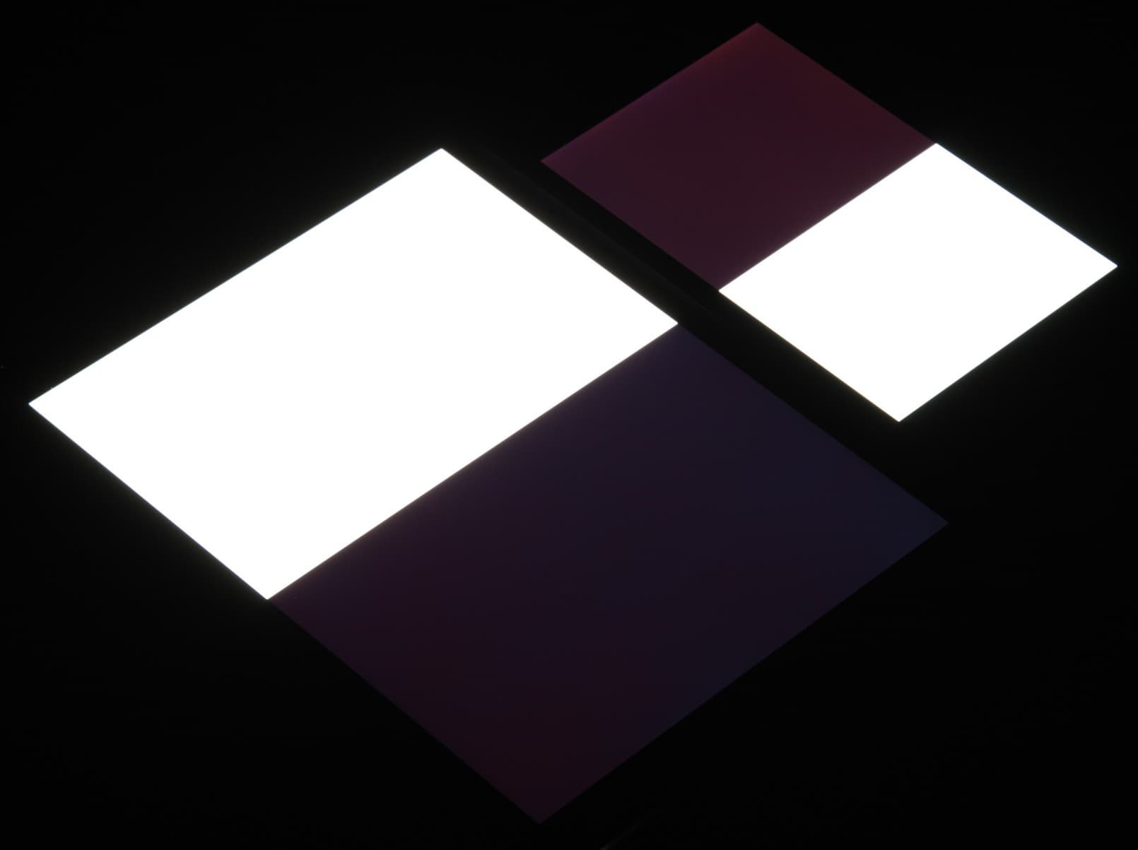 Яркость под углом у экранов уменьшилась (как минимум в 4-5 раз, исходя из разницы в выдержке), но в случае iPad Pro 10,5″ падение яркости меньше. Черное поле при отклонении по диагонали высветляется очень слабо и приобретает фиолетовый оттенок. Фотографии ниже это демонстрируют (яркость белых участков в перпендикулярном плоскости экранов направлении примерно одинаковая!):